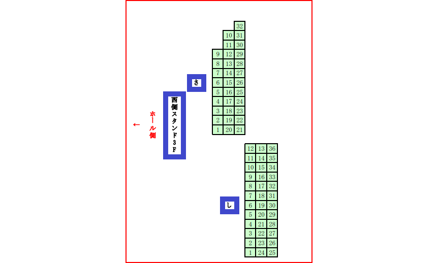 | 東スタンド | 9列 | ー | 3列 |