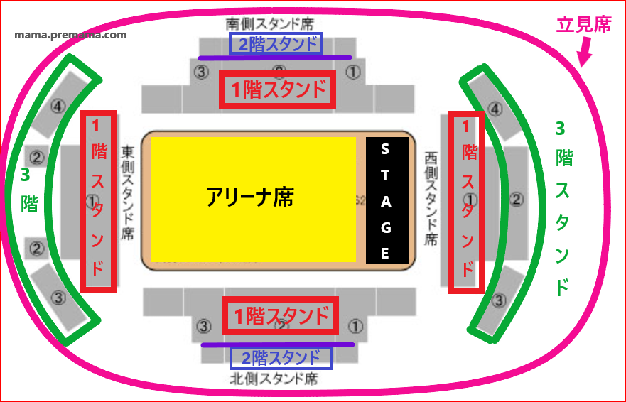 スタンド席は「1階スタンド席」「2階スタンド席」「3階スタンド席」があります。