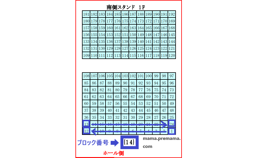 1階スタンドと2階スタンドのブロックは数字になっていて、3階スタンド席のブロックは「あ~な」のひらがなになっています。