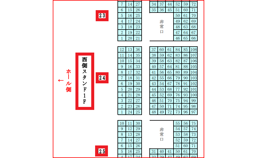 スタンド席の列数は以下のとおりです。