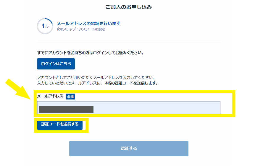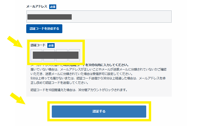 登録したメールアドレス宛に届いている「認証コード」を入力し、「認証する」を押します。