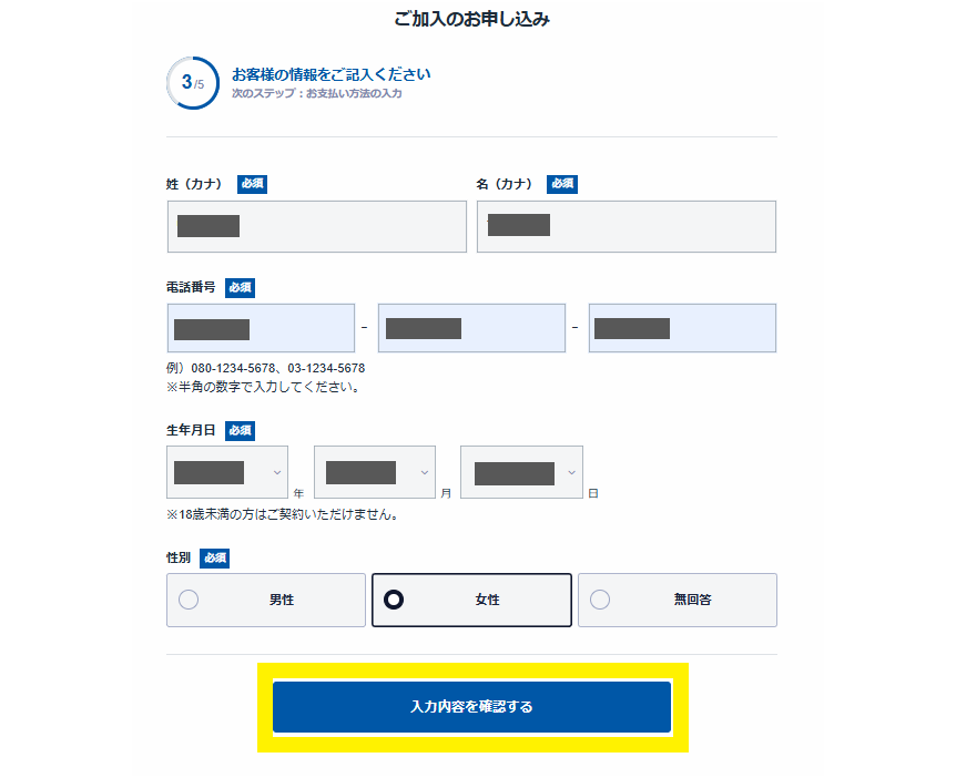 ①必要事項(名前・電話番号・生年月日・性別)を入力します。