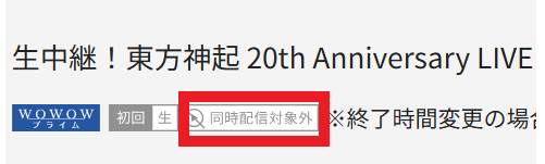 たとえば、こちらのように「同時配信対象外」と書かれている番組はテレビ放送(BS)のみということになります。